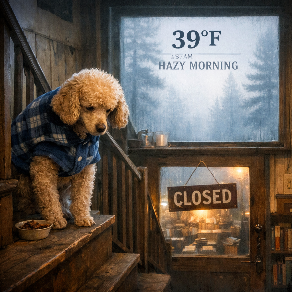 5:53 PM | 57°F | Partly Sunny The sun is dipping, casting long, orange shadows over the “Uncommon” sign. It’s time to close up the ledger and head back upstairs. Hughey is already standing by the back door, his three legs balanced perfectly, looking up as if to remind me that dinner is served at six, and not a minute later.